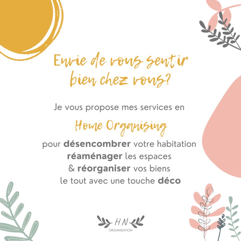 Pour y parvenir, je vous propose une large gamme de services en matière de Home Organising (désencombrement de votre habitation, réaménagement des espaces et réorganisation de vos biens avec une touche déco), Home Management (coaching en gestion du temps), Office Organising (réorganisation des espaces de travail, à domicile ou en entreprise) et Event Organising (organisation d’événements privés ou professionnels).