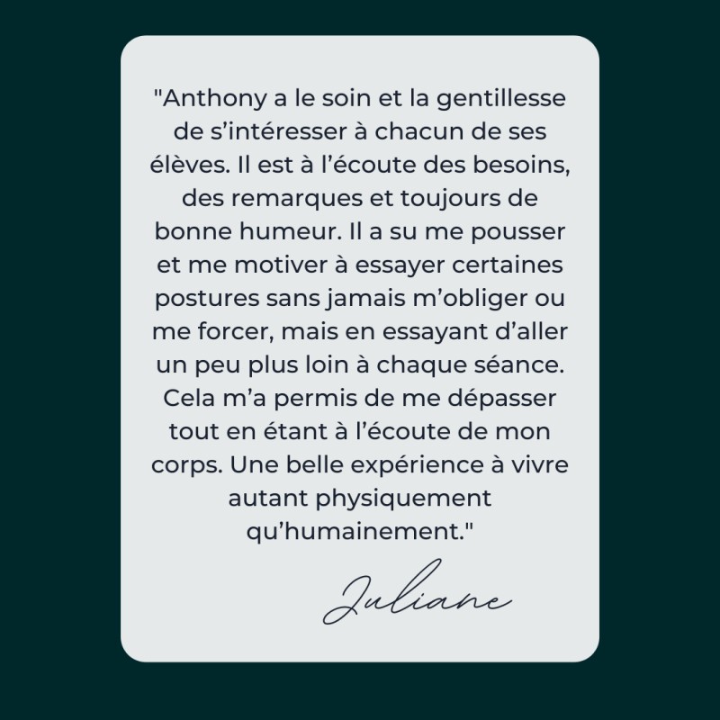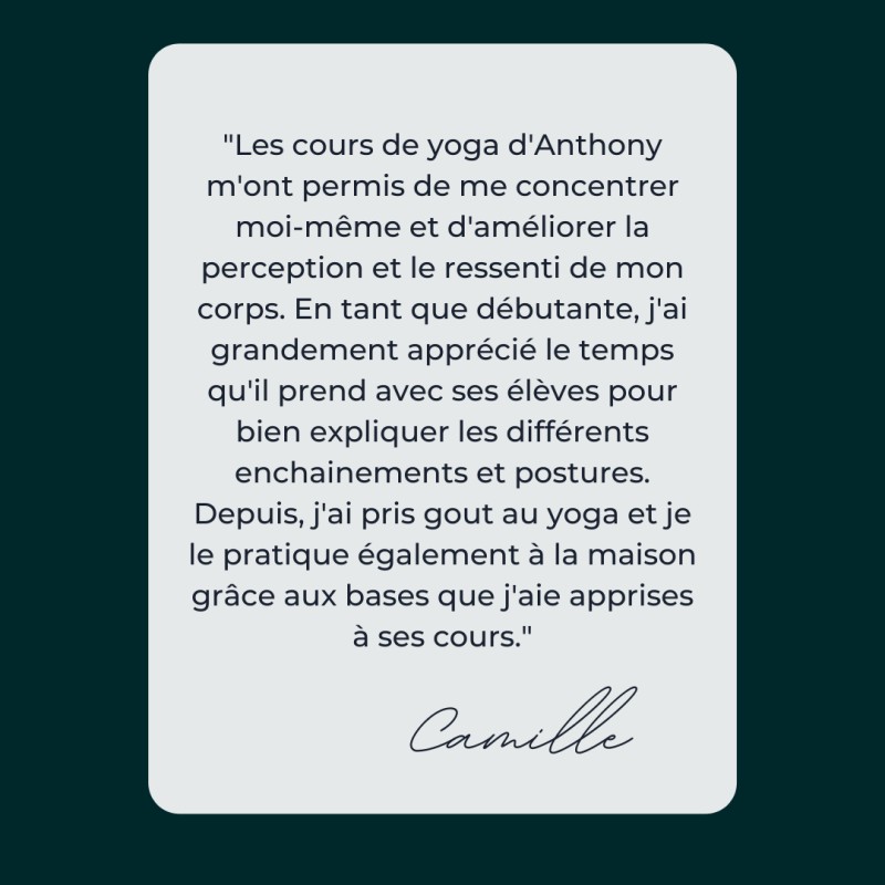 Le yoga que je pratique et que j'enseigne est appelé yoga vinyasa. Le Vinyasa est un yoga dynamique où les postures s'enchainent et sont liées entre elles par la respiration pour créer un tout fluide. Le yoga vinyasa vous permettra de développer votre résistance musculaire, votre souplesse et votre système cardiovasculaire. En nous concentrant parallèlement sur la respiration, notre attention est alors dirigée vers l'intérieur et l'on exerce notre mental qui se renforce. Le yoga nous apporte de la stabilité et nous rend plus conscient·e·s de nous-mêmes et du monde qui nous entoure.